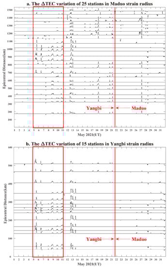 According to the seismogenic zone of the Maduo and Yangbi earthquakes, there were 72 GPS stations in Maduo and 21 GPS stations in Yangbi from 113 stations. As shown in Figure 1, some stations were almost as far from the epicenter. If data of all stations are displayed, part of the data will overlap in the figure and would not be clearly seen. For a clearer display, we sorted the distances between the stations and the epicenter, then selected the station closest to the epicenter, then selected the next station according to a certain distance interval, up until the farthest station. Finally, we selected 25 and 15 GPS station in Maduo and Yangbi seismogenic zone, respectively. The TEC anomaly of each station was extracted by the interquartile range method. Figure 4 shows the variation of GPS TEC anomalies with time, according to the distance from the station to the epicenter.