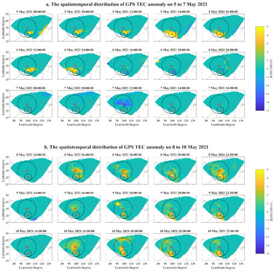 The spatiotemporal distribution of GPS TEC anomalies. The subfigures (a,b) represent the spatiotemporal distribution of GPS TEC anomaly for 5 to 7 May and 8 to 10 May, respectively. The red pentagrams represent the epicenters of the earthquakes; Maduo was to the north of Yangbi. The two black circles represent the seismogenic zones of the earthquakes.