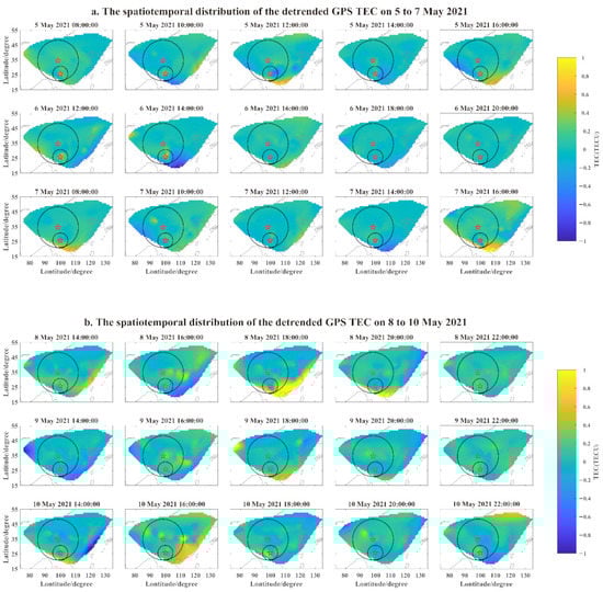The spatiotemporal distribution map of the detrended GPS TEC data. The subfigures (a,b) represent the spatiotemporal distribution of the detrended GPS TEC data for 5 to 7 May and 8 May to 10 May, respectively. The red pentagrams represent the epicenters of the earthquakes; Maduo was to the north of Yangbi. The two black circles represent the seismogenic zones of the earthquakes.