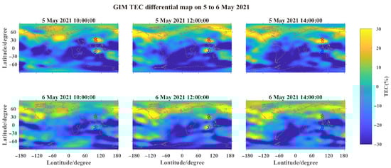According to previous studies [13,42], GIM TEC can magnetically record conjugated effects of ionospheric anomalies. We detect conjugated effects by the GIM TEC differential map on 5 to 10 May. The absolute value of TEC at night can be an order of magnitude lower than daytime values. Similar to the method of Pulinets et al. [43], we used percentages to detect small deviations in absolute values at night, which also filtered out daily TEC changes associated with changes in solar UV radiation levels. A GIM TEC differential map was calculated with the formula DTEC = 100(TEC − MTEC)/MTEC, where MTEC is the average TEC value calculated from the 15 previous TEC values for the same moment in time.
