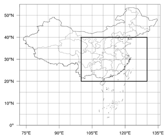 Study area in this study. The black rectangular box in the figure is the specific study area chosen for this study (the range of longitude from 100° to 130° E and latitude from 20° to 40° N).