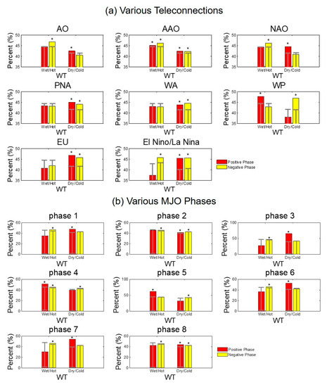 Autumn season WT frequency during various teleconnections (AO, AAO, NAO, PNA, WA, WP, EU, El Niño/La Niña, and MJO). (a) Various Teleconnections (AO, AAO, NAO, PNA, WA, WP, EU, El Niño/La Niña), (b) Various MJO Phases (phase 1–8). Red indicates a positive phase, and yellow indicates a negative phase. Asterisks indicate significance at the 95% level.