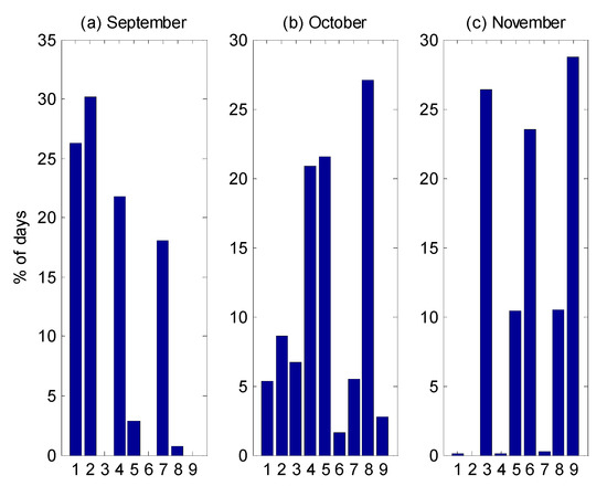 Frequency statistics for each weather modality during the three months of autumn. (a) September, (b) October, and (c) November. This figure helps to observe the intra-seasonal variations in the frequency of occurrence of the WTs.