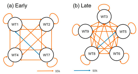 A Markov chain is a stochastic process in which the transition between two states in the state space is memoryless. The probability of a state transfer at a given moment depends only on its previous state. None of the events preceding it in the time series are relevant. The transition patterns between different weather patterns in meteorology can also be analyzed using Markov chains [69]. In the clustering results, if the number of days in each WT is not equal, the conditional probability model needs to be used instead of the equal probability model. This conditional probability does not represent the absolute likelihood that a type will occur. The equal probability model implies the same likelihood of occurring on the next day for each pattern. It leads to a bias of the results in favor of the class of more elements. For example, in this study, WT2, WT4, and WT8 contain elements with >450 days, while WT1, 3, 5, 6, 7, and 9 all contain elements with <450 days. Therefore, the results of the equal probability model will be biased towards WT2, WT4, and WT8.