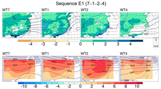 In WT1, a trough is exhibited with higher land surface pressure, a low-pressure system from the southeastern ocean, the temperature and precipitation more than the average. On the one hand, low-pressure convergence tends to form updrafts. On the other hand, wind from the north and south directions converge in the region, which tends to bring sufficient rain. WT4 and WT7 are similar to WT1, except for the location and intensity of the fronts. WT2 has a different wind direction, with southerly winds prevailing and basically covering the whole region.