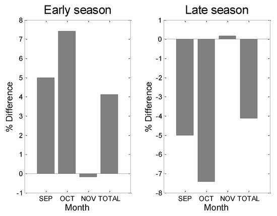 The relationship between the 8 bit phases of the MJO and WT frequencies is shown in Figure 6b. Among them, the fourth and fifth phases of the MJO are most likely to occur in the early season pattern, while the late season pattern is scattered among the remaining six phases of the MJO.