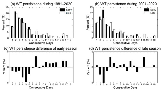 Consecutive days and their differences between the first and second halves of the 1981–2020 period. (a) WT persistence during 1981–2000, (b) WT persistence during 2001–2020, (c) WT persistence difference of the early season, and (d) WT persistence difference of the late season.