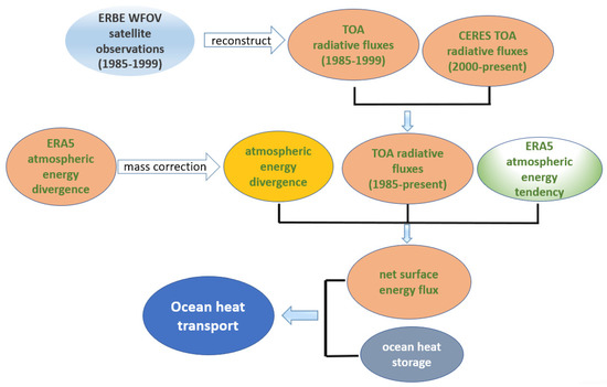 where FO is the energy entering the ocean, and the difference between FS and Fice (FO = FS − Fice). Fice is the energy from sea ice formation and melting, estimated from five ensemble members of ECMWF’s ORAS5 ocean reanalysis [18]. The ocean heat content tendency (OHCT) is calculated from the ocean heat content (OHC) using central differences (e.g., the OHCT in July is the difference of OHCs between August and June and divided by the time difference). Liu et al. [7] calculated the OHCT using the OHC integrated over 0–2000 m. The result shows good agreement in both variability and absolute value with the global mean FS and is therefore used in this study. The flowchart of data retrieval is displayed in Figure 1.