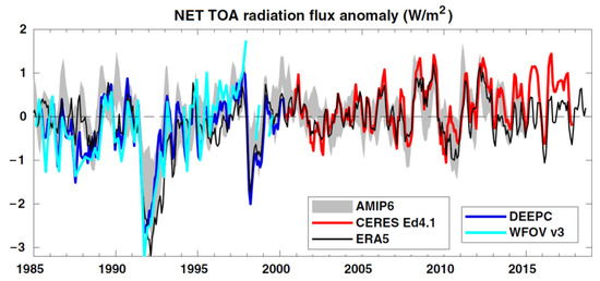 It is noticed that the ensemble mean of ten AMIP6 net TOA fluxes has good variability agreement with observations. The ERA5 data have very close co-variations with CERES data before 2012, but the CERES data are larger than the ERA5 after 2012; the reason for this discrepancy is not clear and needs further investigation.