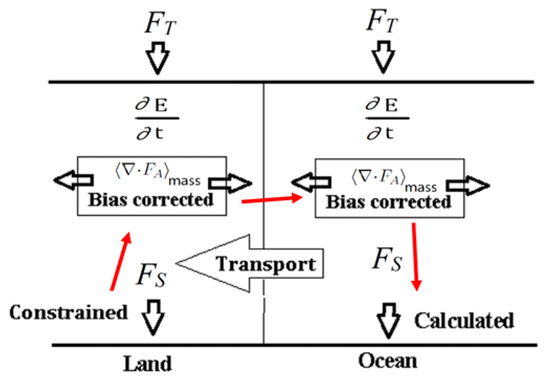 Schematic diagram showing the energy flow in the climate system. The land surface flux is constrained by new observations, the atmospheric divergences over land and ocean are adjusted to respond to this constraint, and the surface energy fluxes can be estimated using the residual method. Red arrows indicate the adjustment sequence after the land surface flux is constrained.