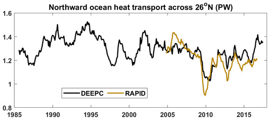 The DEEPC data can be downloaded from https://researchdata.reading.ac.uk/347/ (accessed on 26 October 2021), The ORAS5 data from https://www.cen.uni-hamburg.de/icdc/data/ocean/easy-init-ocean/ecmwforas5.html (accessed on 2 January 2020), the RAPID data from https://rapid.ac.uk/rapidmoc/rapid_data/datadl.php (accessed on 22 December 2020), and the AMIP6 data from https://esgfnode.llnl.gov/projects/cmip6/ (accessed on 6 October 2021). We acknowledge all teams and climate modeling groups for making their data available.