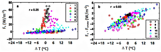 (a) Scatter plot between the net surface energy flux Fs and surface temperature change ΔT at a land location for each month (1–12 means JAN-DEC). (b) Scatter plot between Fs − Fsnow and surface temperature change ΔT. Fs (W/m−2) Fs − Fsnow (W/m−2) ΔT (°C).