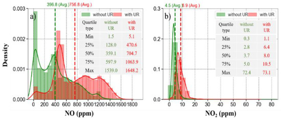 Obvious differences occurred in the density distributions of NO and NO2 instantaneous volumetric concentrations for the situation with and without UR (Figure 1). The height of the histogram herein represents the density, while the kernel density estimation curve represents a smoothed histogram that can demonstrate the distribution characteristics of data. Since the differences in driving conditions with and without UR are negligible (Table 2), it can be assumed that the change in concentration distribution is caused by the use of UR. For NO concentrations, an obvious bimodal distribution (mode concentration: 50 and 400 ppm) occurred for the vehicle without UR, while a trimodal distribution (mode concentration: 500, 950, and 1200 ppm), mostly attributed to the various driving conditions during the tested trip with different road types, was observed for the vehicle with UR. Consistent with the larger mode concentrations caused by the usage of the UR, the distribution of the NO concentrations around 500 ppm and above 800 ppm also exhibited larger densities. For NO2 concentrations, a unimodal distribution occurred for the vehicle both without and with UR, but the mode concentration of the vehicle with UR (7 ppm) was relatively larger than that without UR (4 ppm). Additionally, larger distribution densities of NO2 concentrations above 7 ppm were observed due to the usage of UR. Associated with increased mode concentrations and distribution densities at high concentrations, the min, max, 25th, 50th, and 75th percentile of the NO and NO2 concentrations were also found to be markedly increased by the illegal application of the UR (Figure 1). These phenomena are probably related to the fact that the NO and NO2 with large concentrations mostly emitted under severe driving conditions cannot be effectively reduced by the malfunction of the SCR caused by the UR.