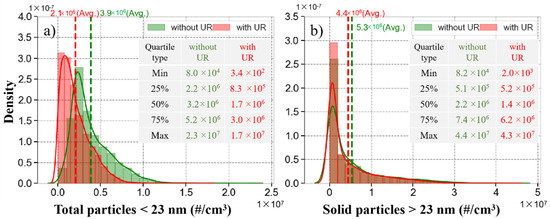 Comparison of the density distributions for total <23 nm (a) and solid >23 nm (b) PN volumetric concentrations with and without the illegal application of urea regulator.