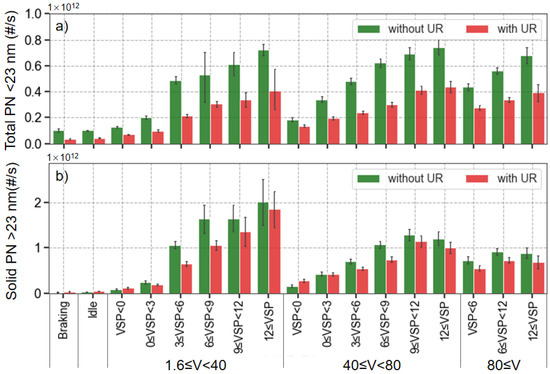The average emission rates of total <23 nm and solid >23 nm PN of the truck with and without UR in various VSP and speed bins are demonstrated in Figure 4. The average VSP-bin total <23 nm and solid >23 nm PN emission rates of the vehicle without and with UR both generally exhibited obvious increasing trends in all speed ranges. Compared to the neglective differences in the VSP-bin peak emission rates among different speed ranges for the total <23 nm particles, the peak VSP-bin solid >23 nm PN emission rate of the low-speed range was higher than that in the other speed ranges. It was clear that the total <23 nm particles are more sensitive to the high engine load under high-speed driving conditions when compared to the solid >23 nm particles [31]. Moreover, compared to average solid >23 nm PN emission rates, the average total <23 nm PN emission rates without UR exhibit higher values than those with UR for all VSP and speed bins. Consequently, the usage of the UR resulted in obvious reductions in the average VSP-bin total <23 nm PN emission rates but fewer reductions in solid >23 nm PN emission rates. As shown in Figure 5, larger differences also occurred between the situation with and without UR for the <23 nm PN concentrations when compared to solid >23 nm PN concentrations. This may be explained by the presence of NH3 being more conducive to the formation of total <23 nm rather than solid >23 nm particles [35].