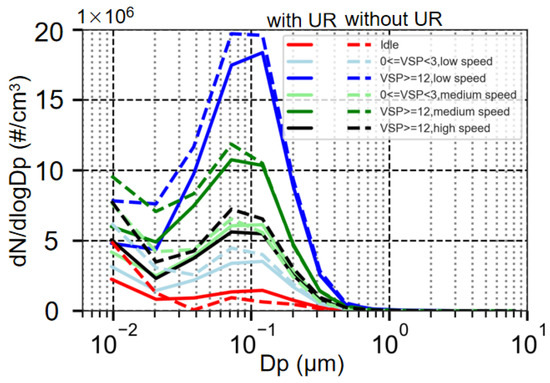 As demonstrated in Figure 3, the density of solid >23 nm and total <23 nm PN instantaneous volumetric concentrations for the vehicle with and without UR both exhibited a unimodal distribution. Contrary to the negative effect on the control of NO and NO2 emissions due to the usage of the UR, a positive control effect occurred for PN emissions. This is mainly attributed to the fact that the limited urea injection caused by the employment of the UR can reduce exhaust ammonia which can form particles [30]. This evidence also indicates that a large number of HDDTs on the road today may produce extra particles related to the urea-SCR operation [19].