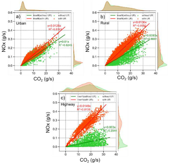As described above, more distinguished effects of the UR can be obtained on NOx compared to PN emissions. Together with the easier access to obtain NOx emissions related to PN during the emission testing and other measurements such as the remote OBD [11], the variations in the correlation of CO2 and NOx mass emission rates between the truck with and without UR under urban roads, rural roads, and the highway are thus analyzed. Figure 6 demonstrates the scatter plot diagram of CO2 (X-axis) and NOx (Y-axis) mass emission rates. The density distributions of emission rates and the fitting lines with intercept set to 0 under different road types with and without UR are also shown here. Clearly, most of the scatter for the truck with UR is located above those without UR, resulting in higher slopes for the fitting line with UR compared to that without UR. Obvious increasing differences in scatter distribution occurred between the situation with and without UR from urban roads, rural roads to the highway. This is mainly related to the increasing reduction effect of the SCR on NOx from urban roads and rural roads to the highway. The density distribution is thus more concentrated on the lower emission rates of NOx without UR compared to that with UR, especially for those emitted under the highway.