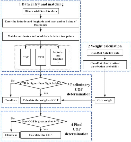 Based on Himawari-8 and CloudSat satellite data, we propose a method to calculate COP. The flowchart of the method is shown in Figure 1.