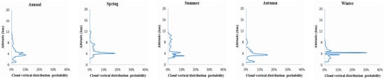 We take BCIA as an example to draw the cloud vertical distribution probability ωj annually and for four seasons, as shown in Figure 2.