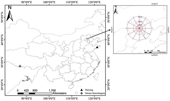 BCIA 12 directions at every 30° interval and the three distances of 100, 200, and 400 km from BCIA (enlarged view). In total, 36 routes were used to calculate COPs. The location of Haiyang (121.22° E, 36.71° N) (triangle) and Mount Qomolangma base camp (86.85° E, 28.14° N) (cross) are shown in the figure.
