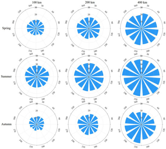 The settings for calculating COP in 12 directions from BCIA are: (1) the time is 02:00 UTC every day during 2016–2020, (2) the flight height is 6 km, and (3) the distances from start point (observing point) to end point (target point) are 100, 200, and 400 km. The COP results at the flight height of 6 km from BCIA are shown in Figure 4 for the whole year (annual) and the four seasons.