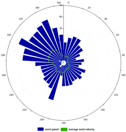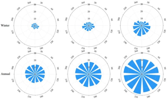 As shown in Figure 4, the COPs increase following distance annually and for four seasons in all directions. The highest COP occurred in summer and the lowest in winter. Among the 12 directions, the COPs in southwesterly directions (180°, 210°, and 240°) are 0.67–3.12% more than northeasterly directions (360°, 30°, and 60°). According to the wind detection data for every hour at the meteorological monitoring point of BCIA (http://data.cma.cn/, accessed on 3 January 2022), during 2016–2019, the most dominant category (20.85%) was non-directional, followed by the northerly wind (19.01%), as shown in Figure 5. The maximum average wind speed angle was in the direction of 320º, and the maximum average wind speed was 14.40 m/s. The instantaneous maximum wind speed was in the direction of 300°. More cloud was distributed in the south and southwest, as shown in Figure 4. In Figure 5, the wind speed in the north is higher than in the south, which is consistent with the prevailing northwestern monsoon in Beijing, especially in winter.