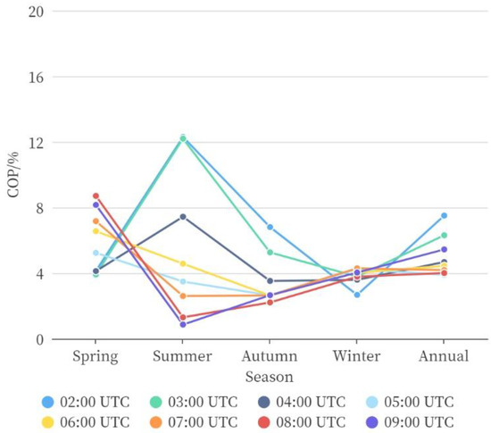 During 2016–2020, at 02:00 UTC (land), the highest COP occurred in summer (17.61%), whereas the lowest COP occurred in winter (0.89%). The COP in spring was 3.70%, and in autumn was 3.30%. During 2016–2020, at 06:00 UTC (land), the highest COP occurred in summer (19.17%), whereas the lowest COP occurred in winter (1.57%).
