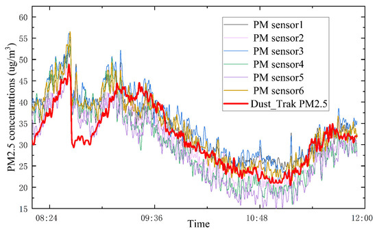 As shown in Table 1, the average PM2.5 concentration measured by the DustTrak in the calibration measurement experiment is 31.7 μg/m3, and the PM2.5 concentration range is 20–49 μg/m3. Among the six PM sensors, the PM sensor 2 is the closest to the data of the DustTrak, with an average relative error of only 11.18%. But the PM2.5 concentration range of PM sensor 2 is 18–51 μg/m3, which exceeds the PM2.5 concentration range of the DustTrak, indicating an overestimation or underestimation between the PM sensors and the reference instrument DustTrak. The average relative errors between the six PM sensors and the DustTrak are all kept within 15%, which are consistent with the errors claimed by the manufacturer; but the average relative errors of 3, 4 and 5 are all over 14%. The PM2.5 concentration range for PM sensor 3 is 21–56 μg/m3, which is higher than the DustTrak, indicating a more serious overestimation. Although these sensors are of the same brand, their PM2.5 measurement results may still show differences. Therefore, it is necessary to calibrate the PM sensors. To further quantify the discrepancies between the six PM sensors and the DustTrak, a comparison between the PM2.5 concentrations from the six low-cost sensors and the DustTrak were given in Figure 2.