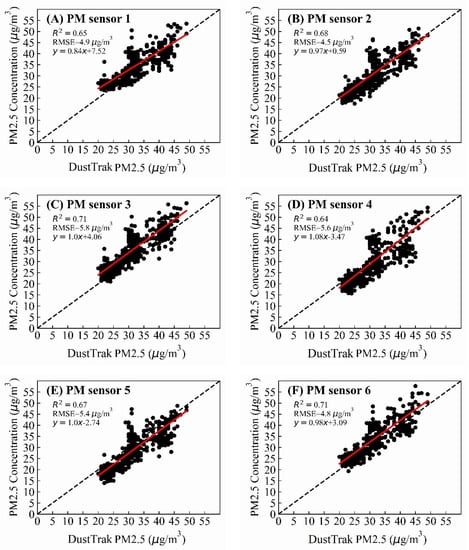 Comparisons of PM 2.5 concentration measured by sensors 1–6 and DustTrak. (Relationship between DustTrak PM2.5 concentration and PM2.5 concentration of PM sensor 1, PM sensor 2, PM sensor 3, PM sensor 4, PM sensor 5, PM sensor 6. The red line is a linear fitting line of DustTrak PM2.5 concentration and PM2.5 concentration of PM sensor).
