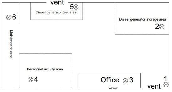 According to the division of the internal space of the diesel generator set, six different areas were selected, and a calibrated PM sensor was placed in each area to measure the concentration of PM2.5. The positions of each measurement point are shown in Figure 3.