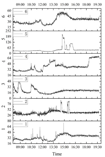 As shown in Figure 3, six monitoring points were arranged at the entrance, the diesel generator storage area, the office, the personnel activity area, the diesel generator testing area, and the maintenance area. The PM2.5 concentrations in the six areas were monitored from 8:00 to 20:00, and the recorded data were uploaded to the experimental platform every 30 s. The monitoring points were 1 m above the ground and placed on the experimental platform without contact with other objects. Among them, the PM sensor in the diesel generator testing area was kept at a distance of 0.5 m away from the diesel generator exhaust port during the diesel generator test. The diesel generator emission test experiments were conducted twice at 14:30 and 15:30, and the total length of each emission test experiment was about 30 min, which is basically consistent with the daily diesel generator test frequency and time of the company. The data of six monitoring points are shown in Figure 4.