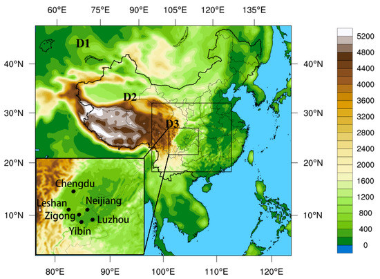 Distribution diagram of simulation area settings (D1: Domain 1; D2: Domain 2; D3: Domain 3; The shaded map is for terrain height from sea level); D3 also includes the locations of Chengdu, Leshan, Luzhou, Neijiang, Yibin and Zigong.