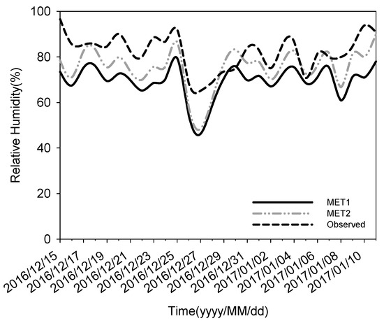 Because the relative humidity is very important for the hygroscopic growth of aerosols [60,61], we compared the simulation and observation results of relative humidity (Figure 2). The results show that: observation > MET2 > MET1. The change trend in the three curves is relatively consistent, but the observed values are higher regardless of the peak or valley. Especially near 27 December 2016 (corresponding to the low pollutant concentrations), the relative humidity of MET1 and MET2 is below 50%, while the observed value is above 60%.