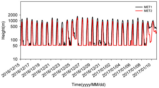 Time series of boundary layer height (PBLH, unit: m) in simulation results of MET1 (black solid line) and MET2 (red solid line).