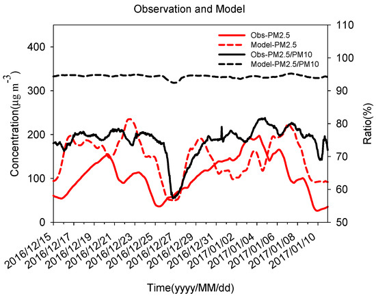 Time series of simulated and observed hourly mean PM2.5 concentrations (μg m−3) and ration of PM2.5 in PM10 (unit:%) of the five cities in Southern Sichuan from 15 December 2016 to 11 January 2017. The solid black line is for Obs-PM2.5, the dash black line is for the ratio of observed PM2.5 in PM10. The solid red line is for Model-PM2.5, the dash red line is for the ratio of simulated PM2.5 in PM10.