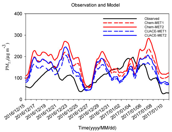 Time series of hourly the 24 h averages of the observed PM2.5 concentration (unit: μg m−3) from 15 December 2016 to 11 January 2017 (solid black line) and simulated PM2.5 concentration from the four groups of tests (red dotted line: Chem-MET1; red solid line: Chem-MET2; blue dotted line: CUACE-MET1; blue solid line: CUACE-MET2) (unit: μg m−3).