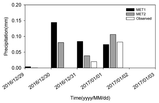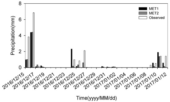 Histogram of hourly the 24 h averages of the observed precipitation (unit: mm) from 15 December 2016 to 11 January 2017 (white bar) and simulated precipitation of MET1 (black bar) and MET2 (grey bar).