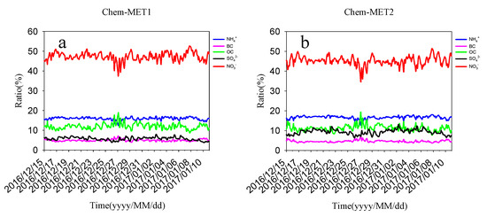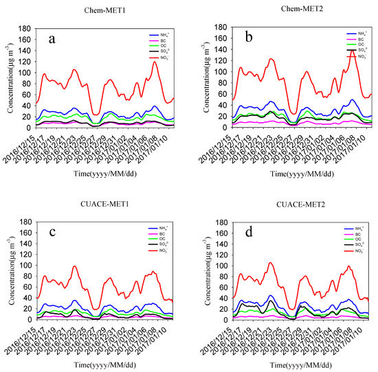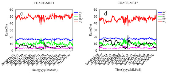 Hourly time series of concentration ratios of ion ammonium salt (blue solid line), BC (purple solid line), OC (green solid line), sulfate (blue solid line), and nitrate (red solid line) simulated by Chem-MET1 (a), Chem-MET2 (b), CUACE-MET1 (c) and CUACE-MET2 (d) (unit: μg m−3) (unit: %).