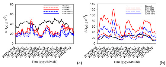 Time series of daily averaged observed (black solid lines) and simulated NO2 concentrations (a), observed and simulated SO2 concentrations (b) of the four tests (red dotted line: Chem-MET1; red solid line: Chem-MET2; blue dotted line: CUACE-MET1; blue solid line: CUACE-MET2). (unit: μg m−3).
