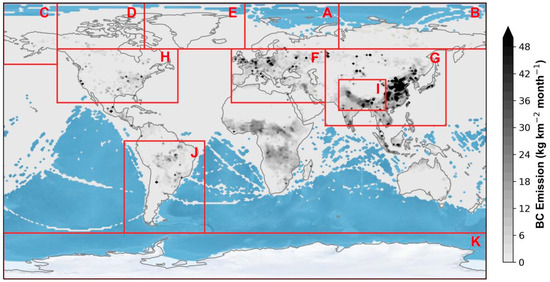 To elucidate the spatial heterogeneity of BCS, total BC emissions from 73 sources were obtained from the global BC emission inventory of Peking University, China, at 0.1° × 0.1° spatial and monthly temporal resolutions for the period 1980–2014 (http://inventory.pku.edu.cn/home.html; accessed on 1 May 2022).
