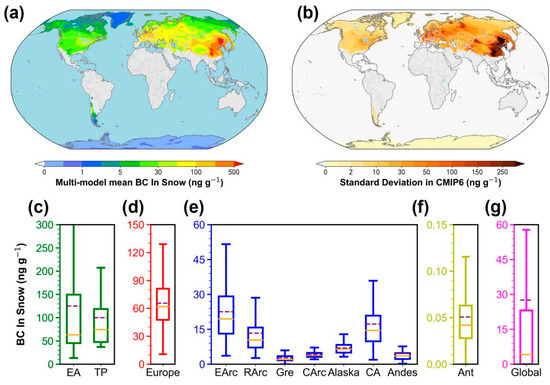 (a) Multi-model mean BC concentrations in snow (BCS) averaged over 1980–2014. (b) Inter-model standard deviation of BCS concentrations for the seven individual-model outputs, 1980–2014. (c–g) Statistics for multi-model mean regional and global BCS concentrations with mean values (purple dashed lines) and median values (orange solid lines).