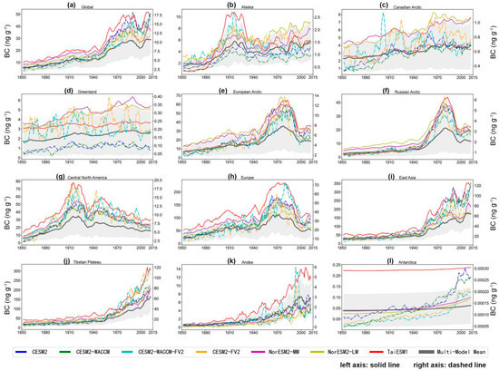 Temporal trends (1850–2014) in yearly BC concentrations in snow (BCS) from multi-model mean and individual models, globally (a) and regionally (b–l). Gray lines represent multi-model mean BCS; other colors represent individual model results. The inter-model standard deviation is shown by gray shading. Data were processed with five-point smoothing. Values for solid lines are on the left axis and those for dashed lines on the right.