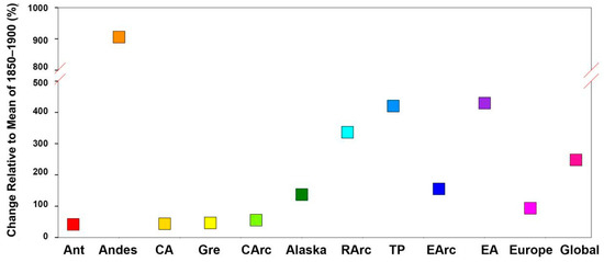 In central North America, multi-model mean BCS concentrations increased rapidly from 10 ng·g−1 in the preindustrial period to ~30 ng·g−1 in the 1920s, before decreasing to present-day levels (Figure 3g). In Europe, multi-model mean BCS concentrations also increased rapidly in the early period, from 20 ng·g−1 during preindustrial times to ~80 ng·g−1 in the 1970s, before decreasing rapidly (Figure 3h), possibly due to the implementation of the Clean Air Act in the early 1970s, which resulted in BC emissions peaking during that decade [12]. For East Asia and the Tibetan Plateau, multi-model mean BCS concentrations before the 1940s were generally stable at low levels of ~25 ng·g−1, before increasing rapidly to exceed 150 ng·g−1 in 2014 (Figure 3i–j and Figure 4). The rate of increase in BCS concentration over the last 70 years in these regions has been much higher than that in other regions, likely due to rapid industrial development in East Asia. Overall, trends in the four mid-latitude regions are related to historical changes in local BC emissions [12].