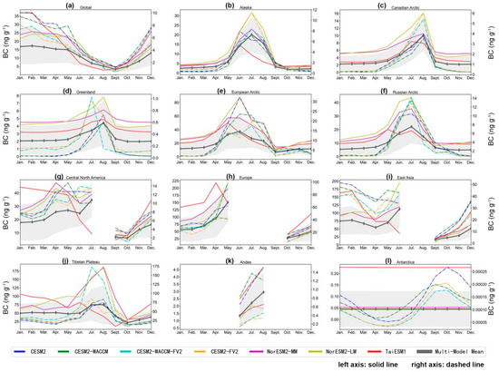 Seasonal BC concentrations in snow (BCS) cycles based on multi-model mean and individual models, averaged over 1850–2014 globally (a) and regionally (b–l). Gray lines represent multi-model mean BCS, other colors indicate individual model results. The inter-model standard deviation is shown as gray shading. Data were processed with five-point smoothing; values for solid lines are on the left axis and for dashed lines on the right. Models are described in Table 1.