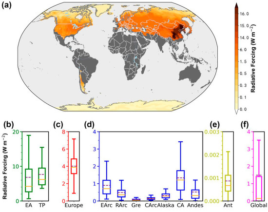 The spatial distribution of RF induced by multi-model mean BCS concentrations averaged over 1980–2014 is shown in Figure 6a, with associated statistics in Figure 6b. The global distribution of BCS-induced RF appears consistent with that of BCS concentration, being higher at mid-latitudes and lower at higher latitudes. The global average BCS-induced RF is ~1.5 W m−2 (Figure 6f), although it is below average in most of the 11 regions studied. BCS-induced RF is strongest in East Asia and the Tibetan Plateau, averaging ~7 W m−2 due to the high BCS concentrations and strong incident radiation [12]. BCS-induced RFS in Europe is slightly lower, averaging ~4 W m−2. All other regions have RF values of <4 W m−2, with the European Arctic and central North American regions being relatively higher, with average levels of ~1 W m−2. The Russian Arctic, Greenland, Canadian Arctic, Alaska, and Andes regions have RF levels of generally <1 W m−2, with the lowest BCS-induced RF occurring in Antarctica, at ~0.001 W m−2.