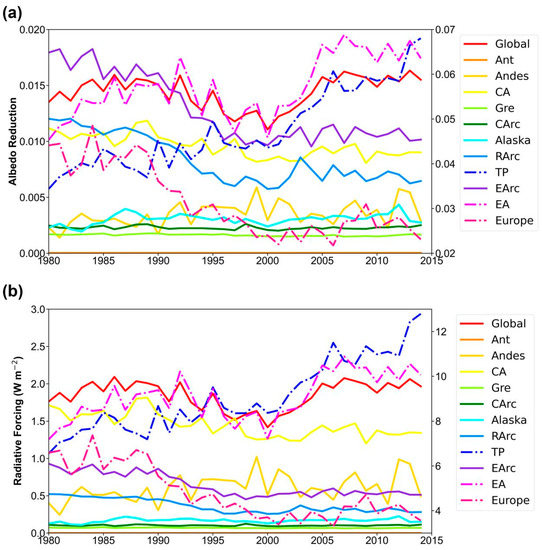 Temporal trends in (a) all-sky albedo reduction and (b) radiative forcing caused by CMIP6 multi-model mean BC concentrations in snow, globally and regionally during 1980–2014. Values for solid lines are on the left axis and for dashed lines on the right.