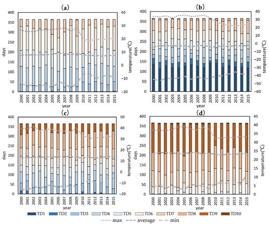 According to the climatic zoning of China [33], we selected representative stations: Guangzhou station, Beijing station, Daxinganling station, and Lasa station. Then, the annual highest temperature, annual lowest temperature, annual average temperature and 10 TD per year for each station were calculated, as shown in Figure 1. Taking the Guangzhou station in Figure 1a as an example, 2005 was the year with the lowest temperature measured during 2000–2015, but the number of TD1 was not the greatest for any year in that category, and many high-temperature days (TD9, TD10) occurred in that year. The highest temperature in the 16 years occurred during 2008, and many high-temperature days (TD9, TD10) occurred in that year. However, low temperature days also occurred frequently. From the perspective of annual average temperature, the gap between these two years and other years is very small. Similar results were found at other stations, which shows that the TD can more sensitively reflect the temperature information for each year than the annual highest temperature, annual lowest temperature and annual average temperature.