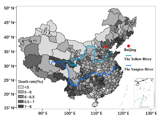where M is the number of deaths in a year, and P is the total population during that year. We collected the annual mortality data of 343 regions for 16 years (2000–2015). The average mortality for the study period of 16 years in each region of China is shown in Figure 2.