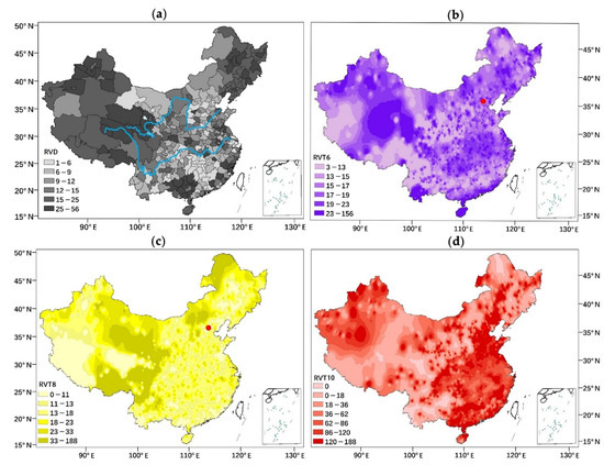 The RVT6, RVT8 and RVT10 are shown in Figure 4b–d. Regions with high RVT6 (Figure 4b) are located in Qinghai, southern Yunnan and southeastern coastal areas. Regions with high RVT8 (Figure 4c) are located in Southeast Tibet, Qinghai, etc. Regions with high RVT10 values (Figure 4d) are located in Xinjiang, Henan, Shandong and southeastern coastal areas. These regions of higher relative variability are almost identical to the regions with high RVD in Figure 4a, demonstrating that corollary (1) is correct.