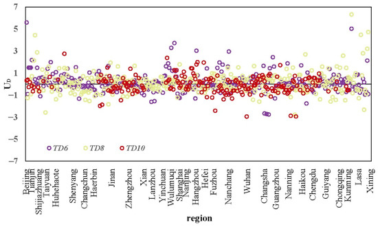 According to Equation (4), TD6, TD8 and TD10 had larger influences on mortality than other temperature categories. Therefore, the abnormal and normal years of all regions were identified in TD6, TD8 and TD10. values for the three temperature categories were calculated, with results shown in Figure 5.